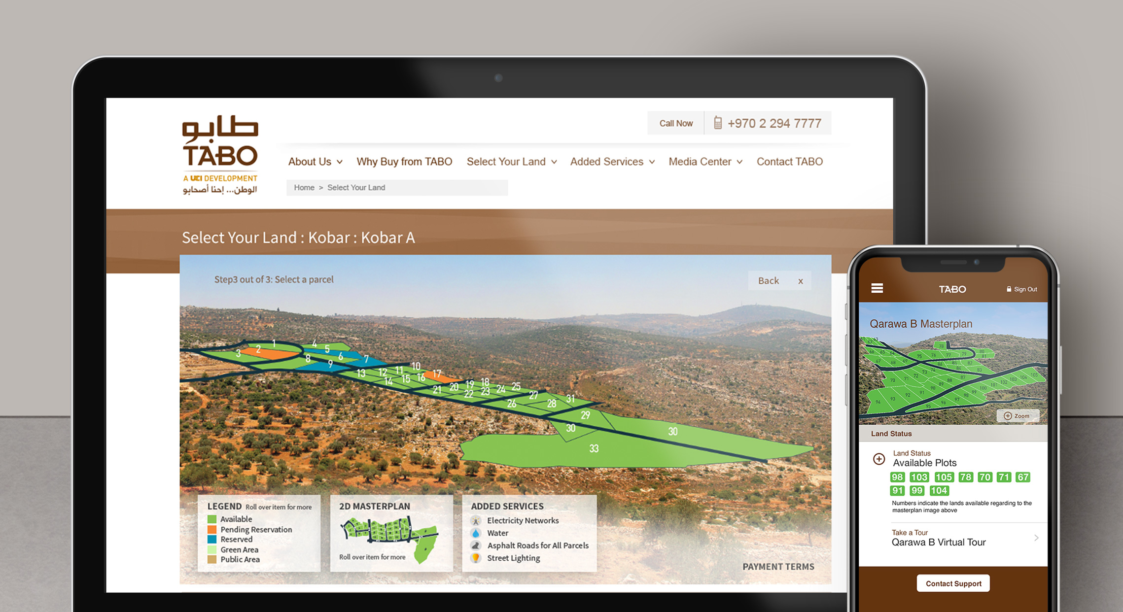 TABO presents a non-traditional automated web application, automates selling company’s listed lands to Palestinians through beautifully integrated interactive 3D models, aerial views, and virtual tours.